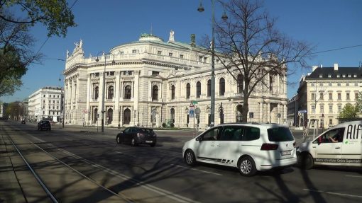 Innere Stadt, the Burgtheater, seen from across Ring Street. The Innere Stadt (old town) of Vienna is UNESCO World Cultural Heritage Site. This take was recorded in the weeks of Covid-19 (Corona virus) lockdown in April 2020, on an otherwise regular workday. Few people, little traffic.