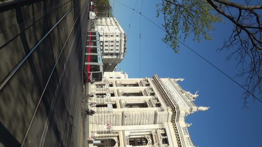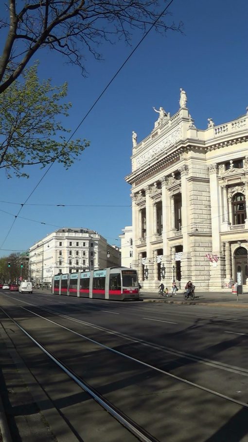 Burgtheater in the old town, seen from across Ring Street. The Innere Stadt (old town) of Vienna is UNESCO World Cultural Heritage Site. This take was recorded in the weeks of Covid-19 (Corona virus) lockdown in April 2020, on an otherwise regular workday. Few people, few cars.