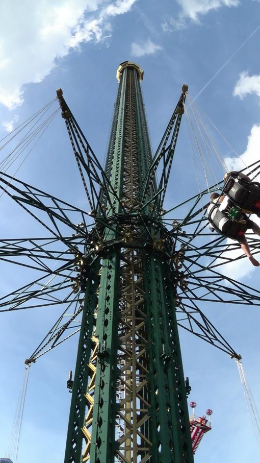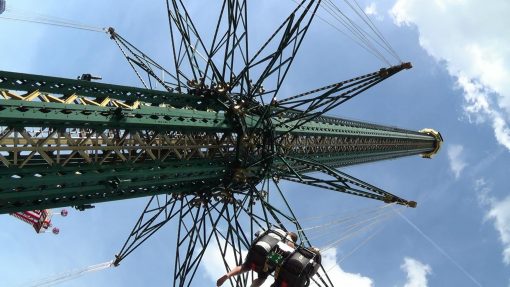 Wurstelprater, the amusement park in the Wiener Prater. The bogie on the tallest merry-go-round descends.