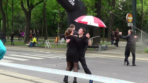 On Ring Street, members of a traditional Viennese Dancing School cheer and inspire the runners at the Vienna City Marathon 2014.