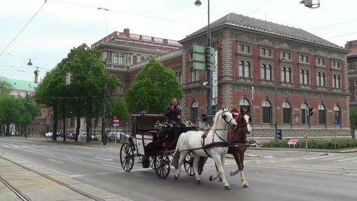 As Ring Street is car free for the Vienna City Marathon, a fiacre seizes the opportunity to rush to work. In the distance the MAK Museum für angewandte Kunst / Gegenwartskunst (Museum for Applied Arts).
