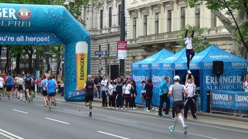 On Ring Street, dancers and acrobats cheer the runners of the Vienna City Marathon.