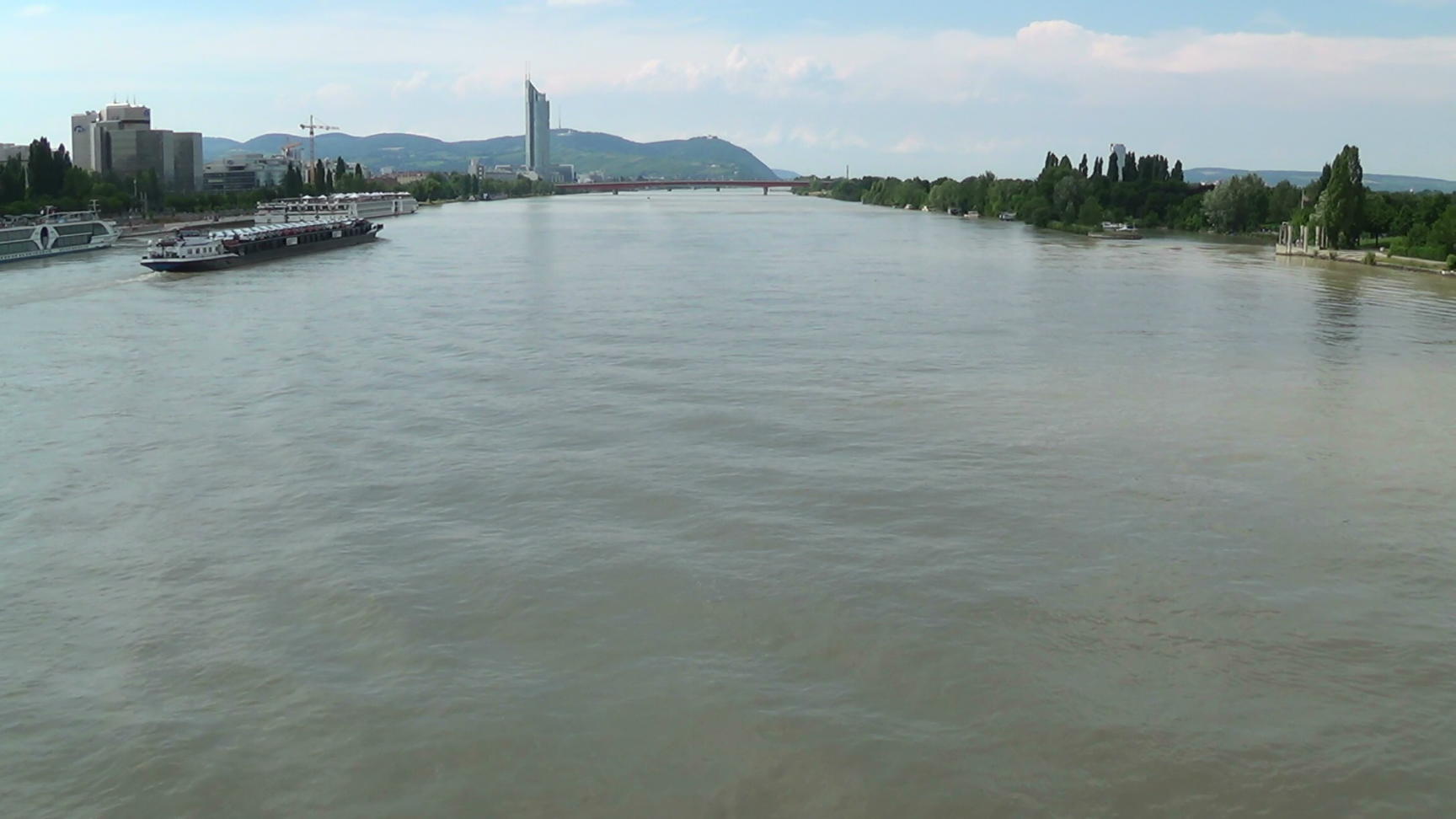 View from Reichsbrücke (Empire Bridge), northwards (upstream). A freighter in the distance. This is a panorama from the left to the right.