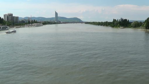 A view from Reichsbrücke (Empire Bridge), northwards (upstream). A hydrofoil city shuttle boat, coming from Bratislava, in the distance. The Danube River (Donau) is the second largest river in Europe.