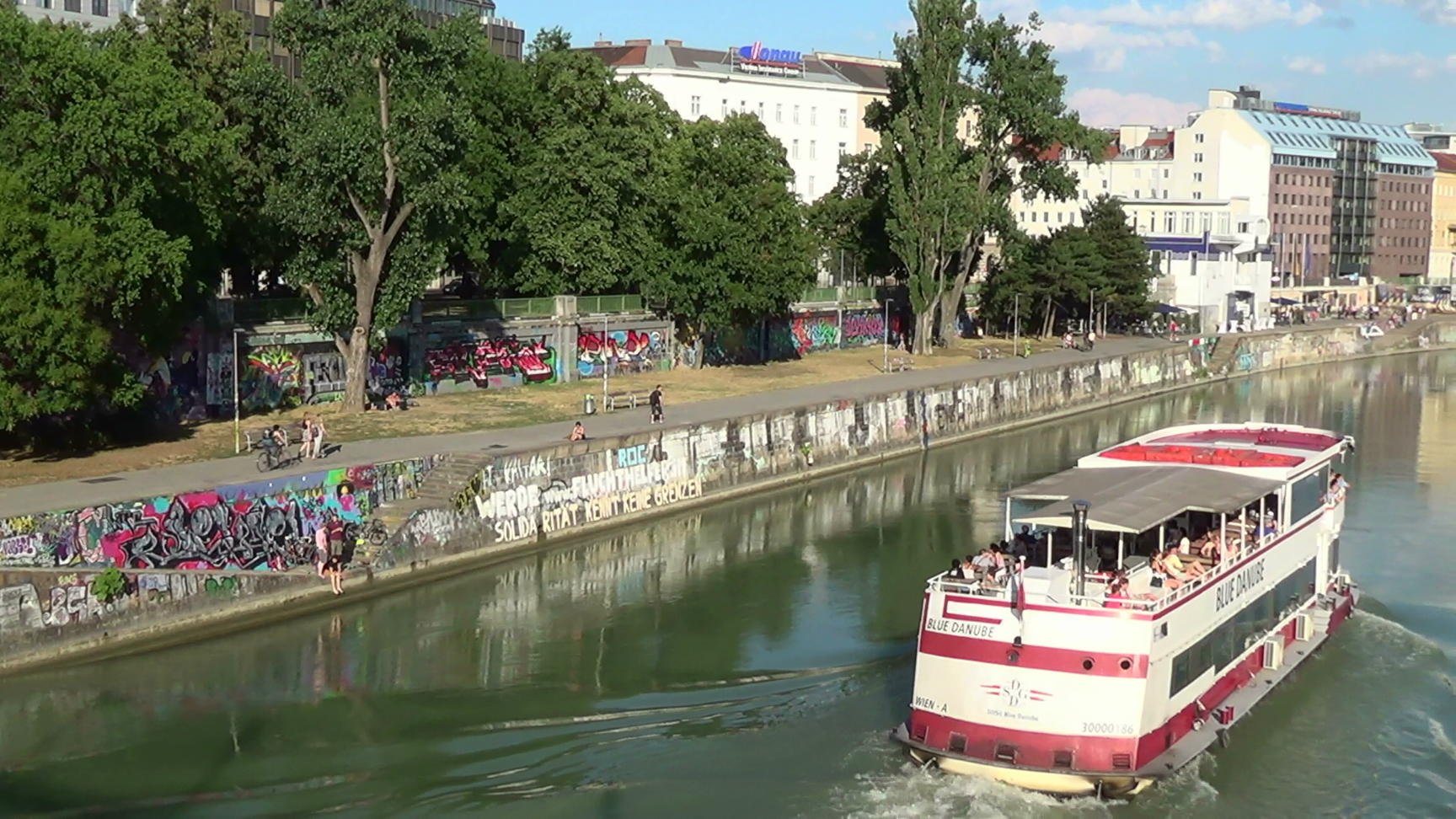 Down at Donaukanal near Schwedenplatz. On the left side (the white/blue house) “Schützenhaus”, next is “Tel Aviv Beach”. On the right side the “Flex” Club. A river boat crosses the scene. This is a panorama from the left to the right.