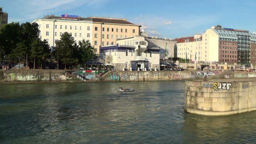 Down at Donaukanal near the old town. The white/blue building is “Schützenhaus”. A police patrol and a private rubber boat pass.