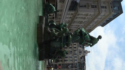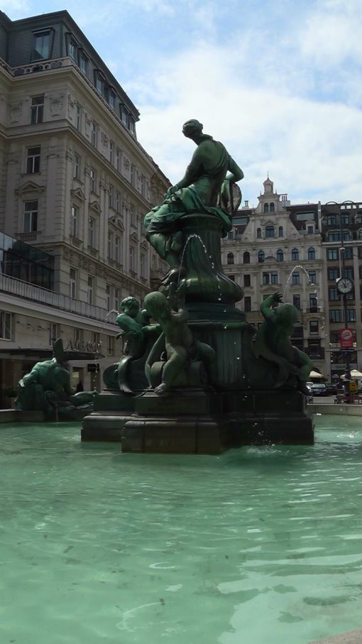 Innere Stadt, Donnerbrunnen (Donner Fountain). Actually, the real name is Providentiabrunnen (Providencia Fountain), but locals named it after the creator, Raphael Donner. UNESCO World Cultural Heritage Site. This ia a close up, showing the centerpiece. A take against the sunlight, hence darker sculpture.