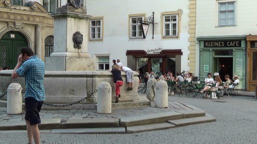 Innere Stadt, Franziskanerplatz (Franciscans Square) with fountain and the popular “Kleines Cafe” (“Small Cafe”) to the right. This take is closer to the fountain than the clips no. 65318 and no. 74002. The old town of Vienna is UNESCO World Cultural Heritage Site.