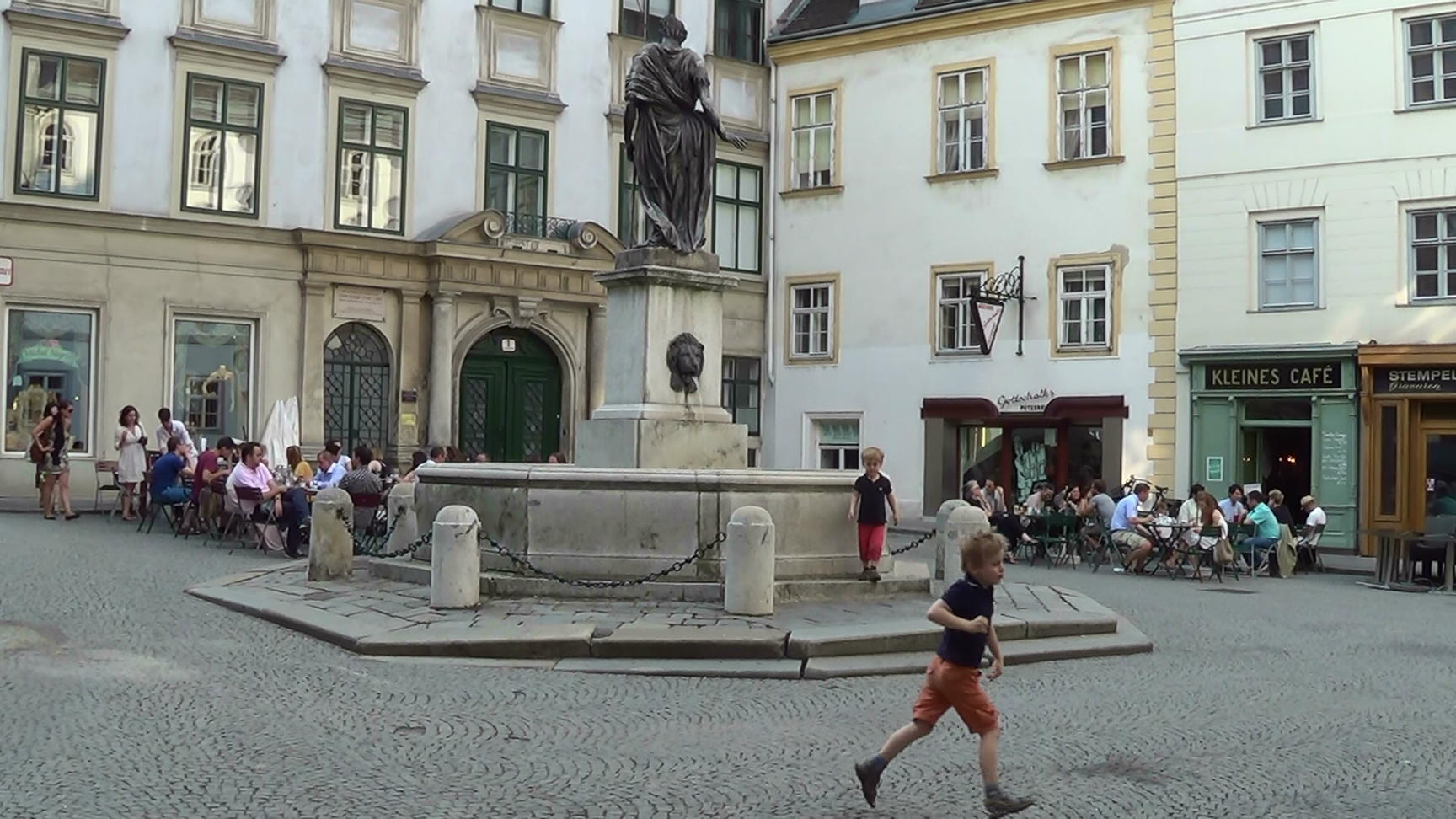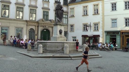 Innere Stadt (old town). Franziskanerplatz (Franciscans Square) with fountain and the popular “Kleines Cafe” on the right hand side. UNESCO World Cultural Heritage Site.