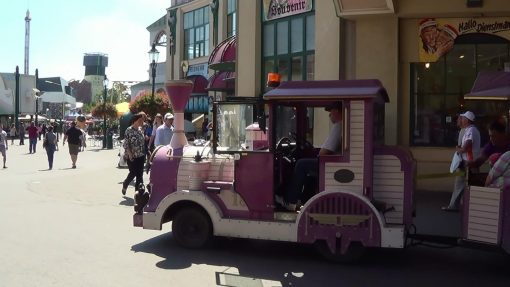 Riesenradplatz (Giant Ferris Wheel  Square, where Riesenrad, the Giant Ferris Wheel is located) seen from the entrance of the amusement park. This is a panorama from the right to the left, following the train.