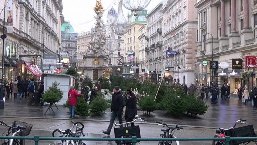 Busy pedestrian zone in the Innere Stadt. Sales of christmas trees on Graben, one of the main streets in the old town. A fiacre with black horses crosses the scene. The Innere Stadt (old town) is UNESCO World Cultural Heritage Site.