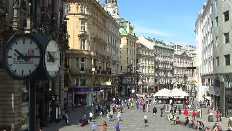 Morning scene on Graben, part of the shopping mile “The Golden U”. To the left, behind the public clock, the Palais Equitable; the Haas House with the rooftop bar is on the right hand side. The Innere Stadt (Old Town) of Vienna is UNESCO World Cultural Heritage Site.