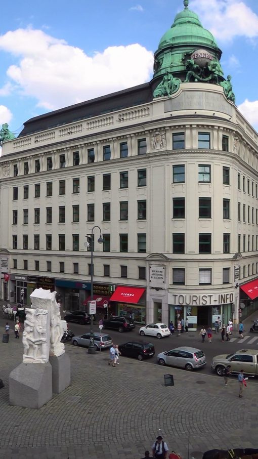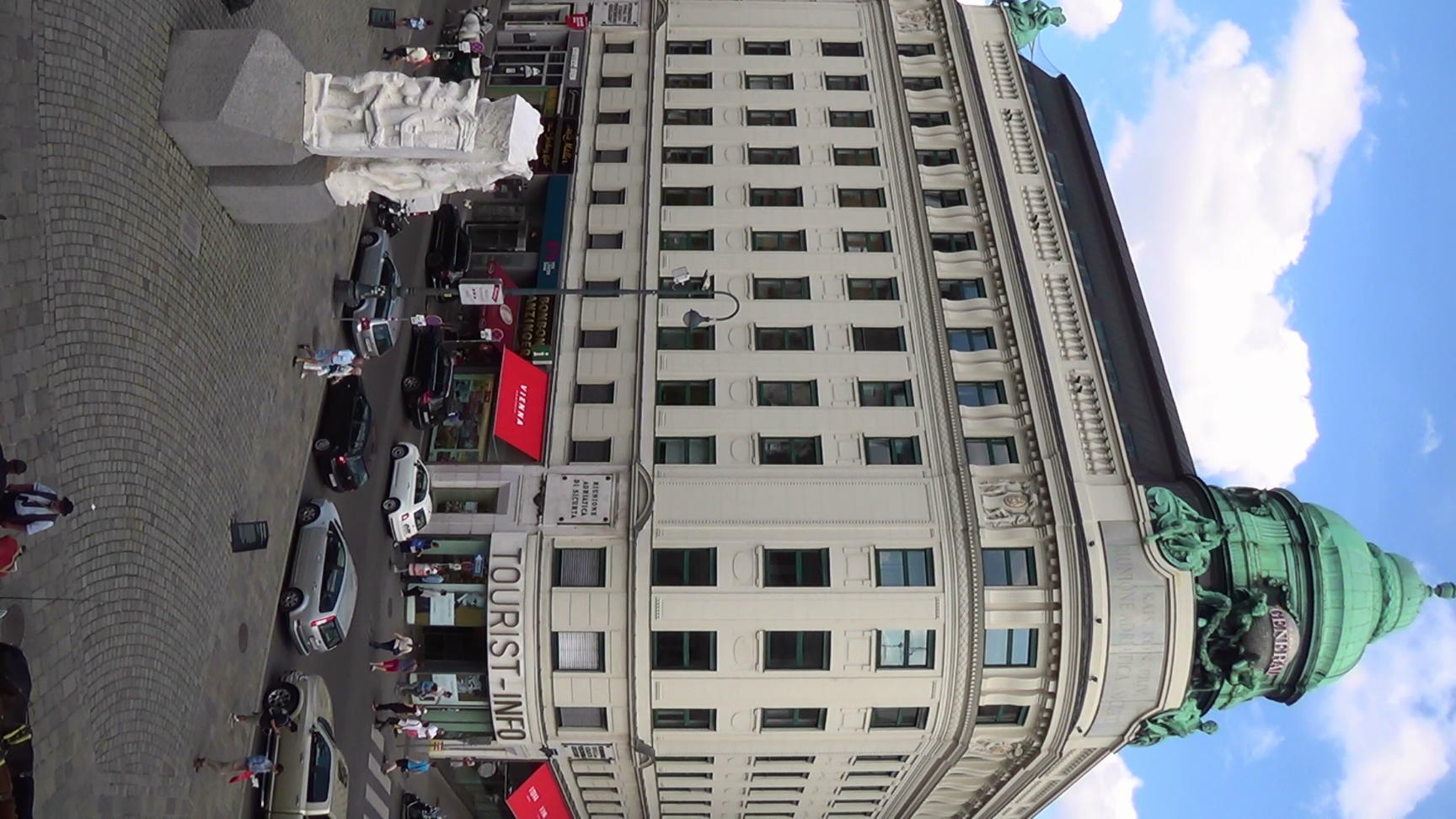 Innere Stadt, Helmut-Zilk-Platz, seen from the Albertina Terrace. The Monument against War and Fascism (Artist Alfred Hrdlicka). This is a panorama from the left to the right. The old town of Vienna is UNESCO World Cultural Heritage Site.