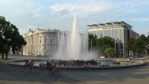 The Fountain on Schwarzenbergplatz (Schwarzenberg Square). The Russian Soldier Memorial is invisible on the right hand side, the Schwarzenberg Palais (Hotel and Congress Complex) is located behind the camera.