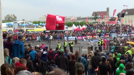 Heldenplatz (Hero Square), the monument of Prince Eugene of Savoy is visible in the distance. On this spring day, Heldenplatz is the finish zone of the Vienna City Marathon.
