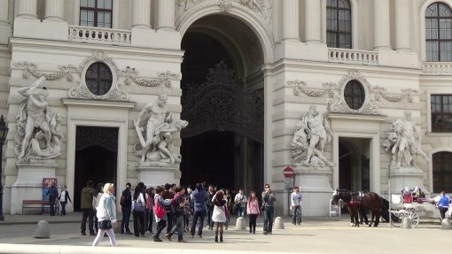 Michaelerplatz in the Innere Stadt, in front of the main gate to Hofburg, the former imperial palace. This is a panorama from the left to the right, along the waiting fiaker carriages. The Innere Stadt of Vienna is UNESCO World Cultural Heritage Site.