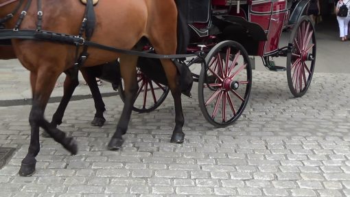 Michaelerplatz in the Innere Stadt (Old Town), a fiaker leaves the Hofburg complex through the main gate.