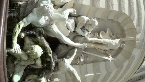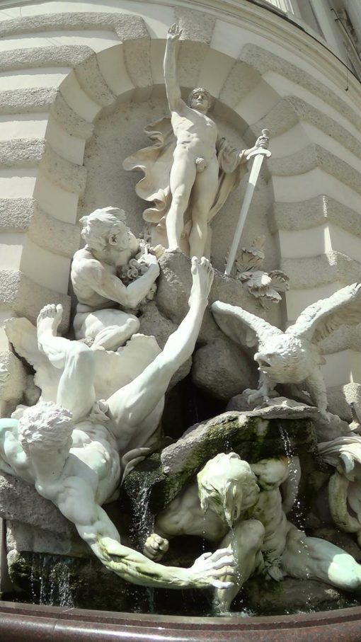 Old town, Michaelerplatz. This is the “Power on Land” fountain on the wall of the Hofburg palace. UNESCO World Cultural Heritage Site.