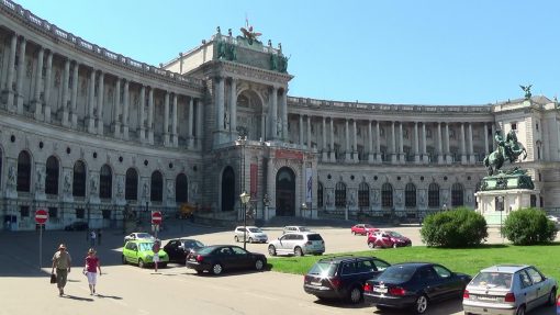 The main entrance to the Austrian National Library at Heldenplatz (Hero Square). In front of the door stands the monument of Archduke Karl. UNESCO World Cultural Heritage Site. Heldenplatz is often the finish zone of the annual Vienna City Marathon.