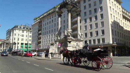 Morning scene on Hoher Markt, the centerpiece is Vermählungsbrunnen (Wedding Fountain). An early fiacre (a traditional horse drawn carriage) passes. The Innere Stadt (Old Town) of Vienna is UNESCO World Cultural Heritage Site.