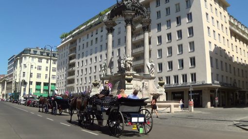 Morning scene on Hoher Markt, the centerpiece is Vermählungsbrunnen (Wedding Fountain). Two fiacres (traditional horse drawn carriages) pass. The Innere Stadt (Old Town) of Vienna is UNESCO World Cultural Heritage Site.