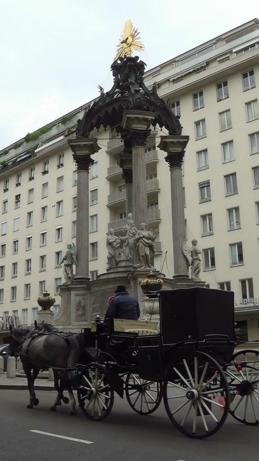 Vermählungsbrunnen (Wedding Fountain) on Hoher Markt in the Innere Stadt (Old Town). A fiacre (a horse drawn carriage) passes. The Old Town of Vienna is UNESCO World Cultural Heritage Site.