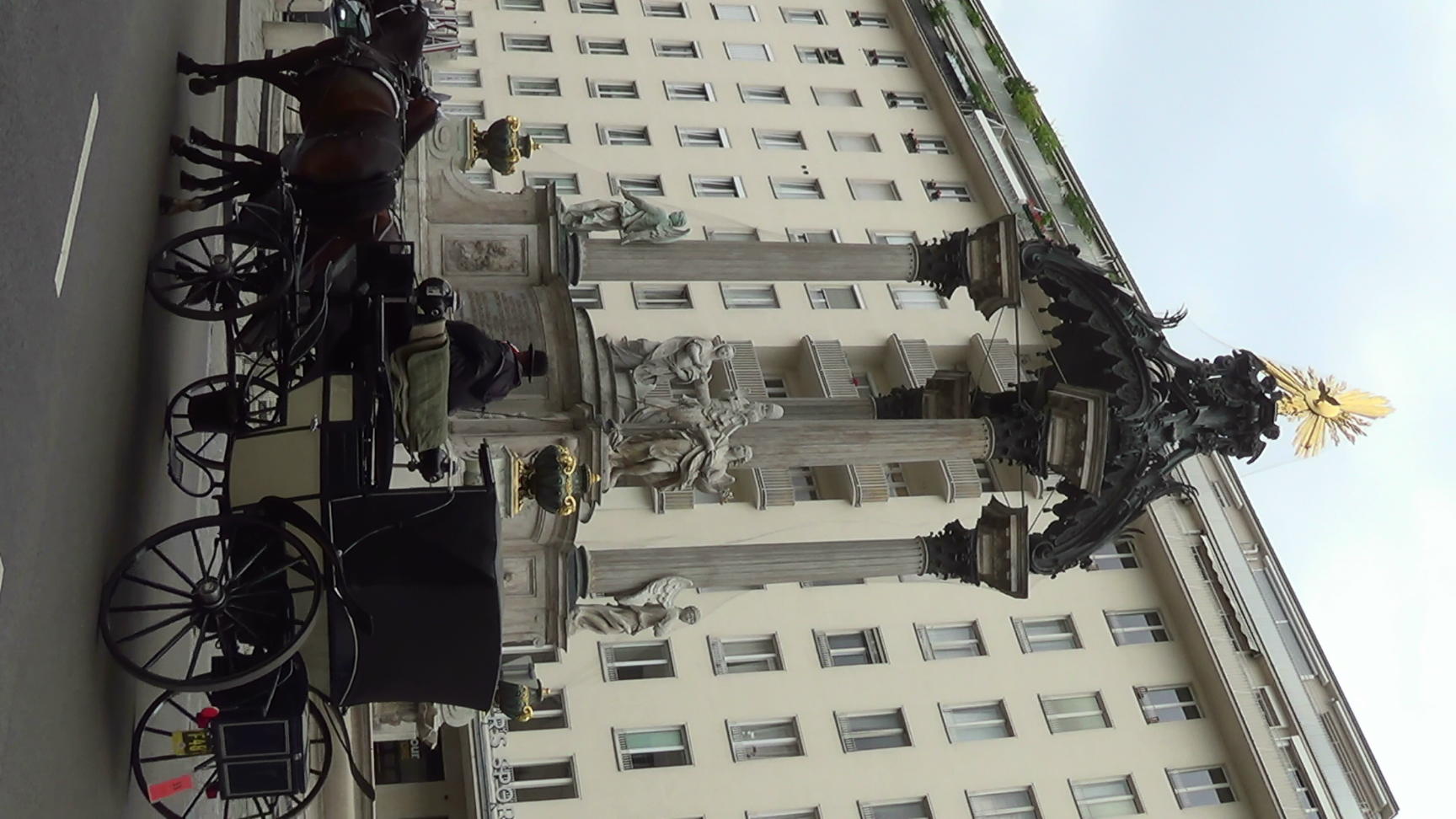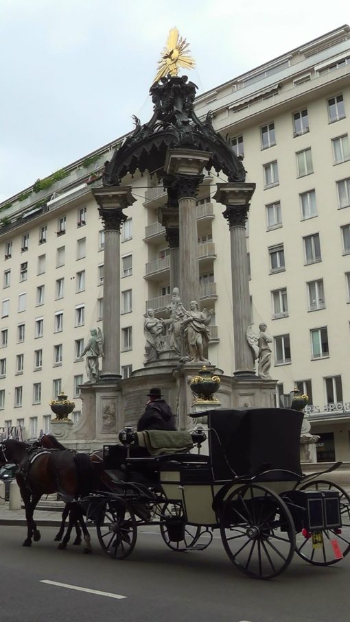Vermählungsbrunnen (Wedding Fountain) on Hoher Markt in the Innere Stadt (Old Town). A fiacre (a horse drawn carriage) passes. The Old Town of Vienna is UNESCO World Cultural Heritage Site