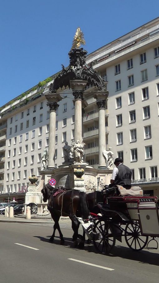 Vermählungsbrunnen (Wedding Fountain) on Hoher Markt in the Innere Stadt (Old Town). A fiaker (a horse drawn carriage) passes. The Old Town of Vienna is UNESCO World Cultural Heritage Site