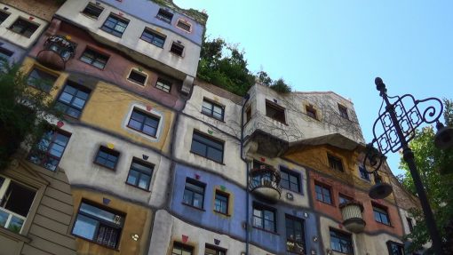 The colourful urban apartment building created by the austrian artist Friedensreich Hundertwasser and the architect Josef Krawina. Hundertwassers motto: The straight line is none of gods inventions. This is a panorama from the left to the right.