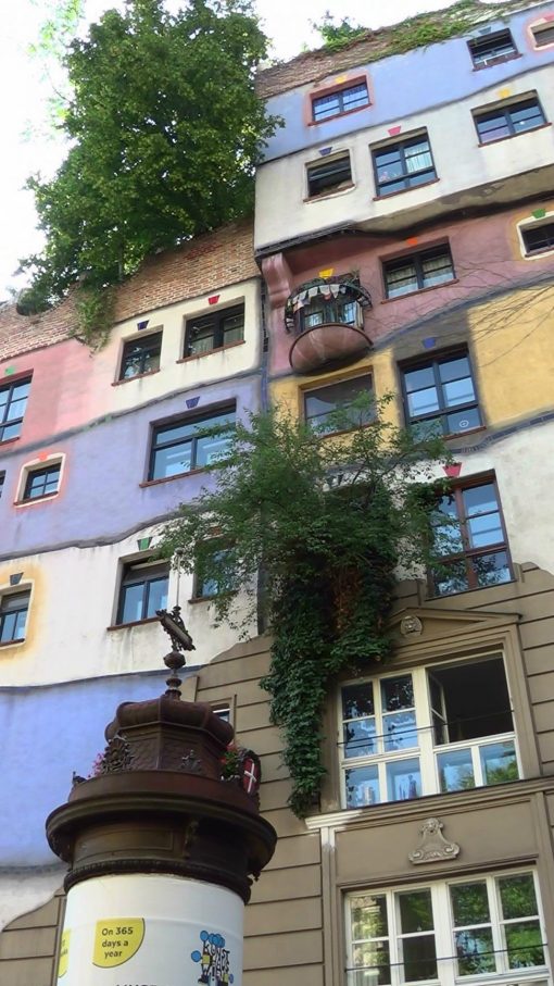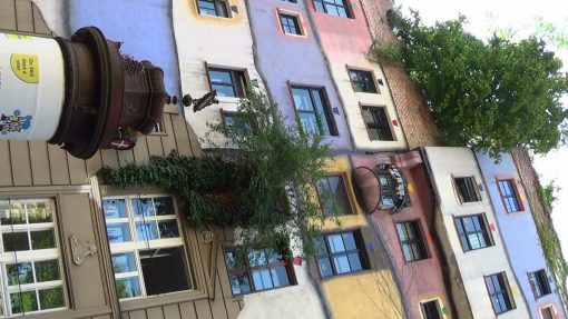 The colourful urban apartment building created by the austrian artist Friedensreich Hundertwasser and the architect Josef Krawina. Hundertwassers motto: The straight line is none of gods inventions. This is a panorama from the right to the left.