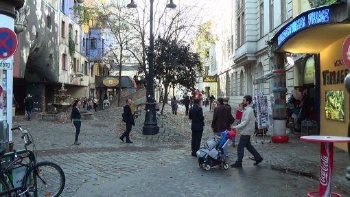 Street scene at the colourful urban apartment building, created by the austrian artist Friedensreich Hundertwasser and the architect Josef Krawina. Hunderwassers motto: The straight line is none of gods inventions.