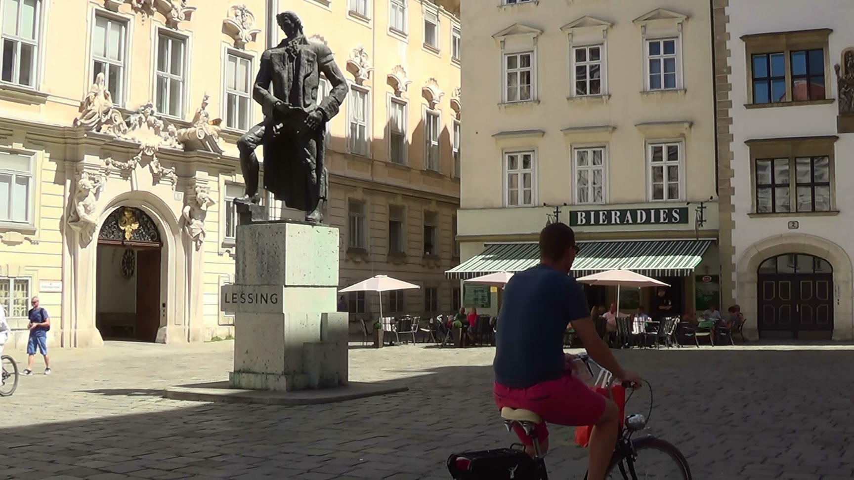 A summer morning in the Innere Stadt. This is Judenplatz (Jews Square) with the statue of Gotthold Ephraim Lessing, a german poet.
