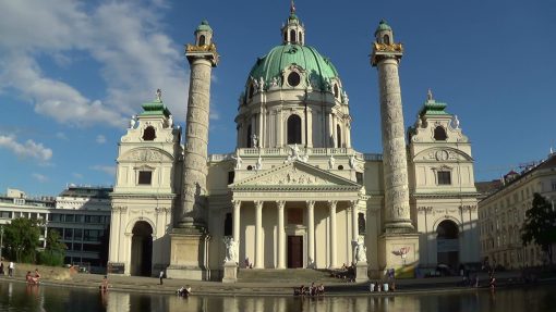 Karlskirche (St. Charles Church), seen over the pond. Panorama from the left to the right. Karlskirche is UNESCO World Cultural Heritage Site.
