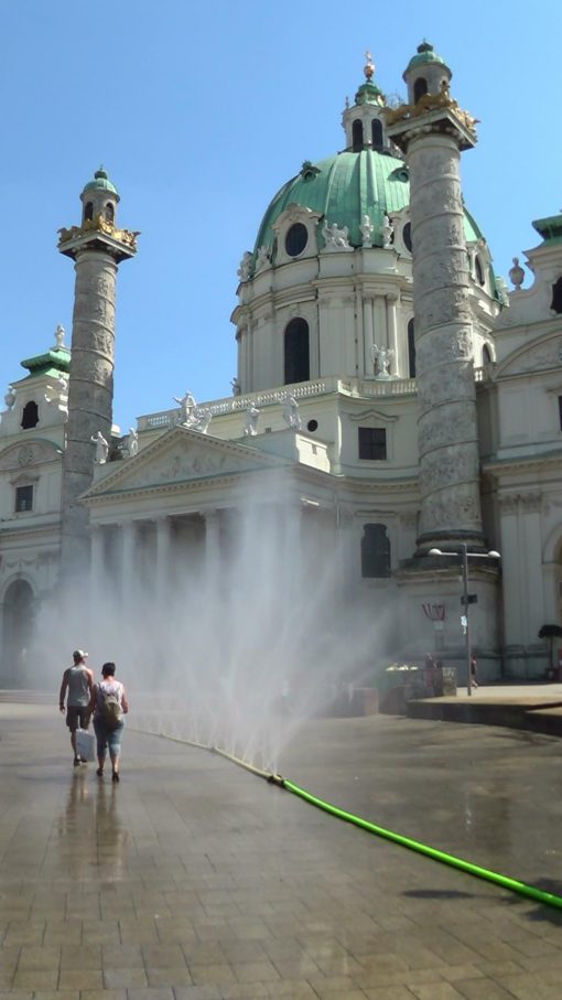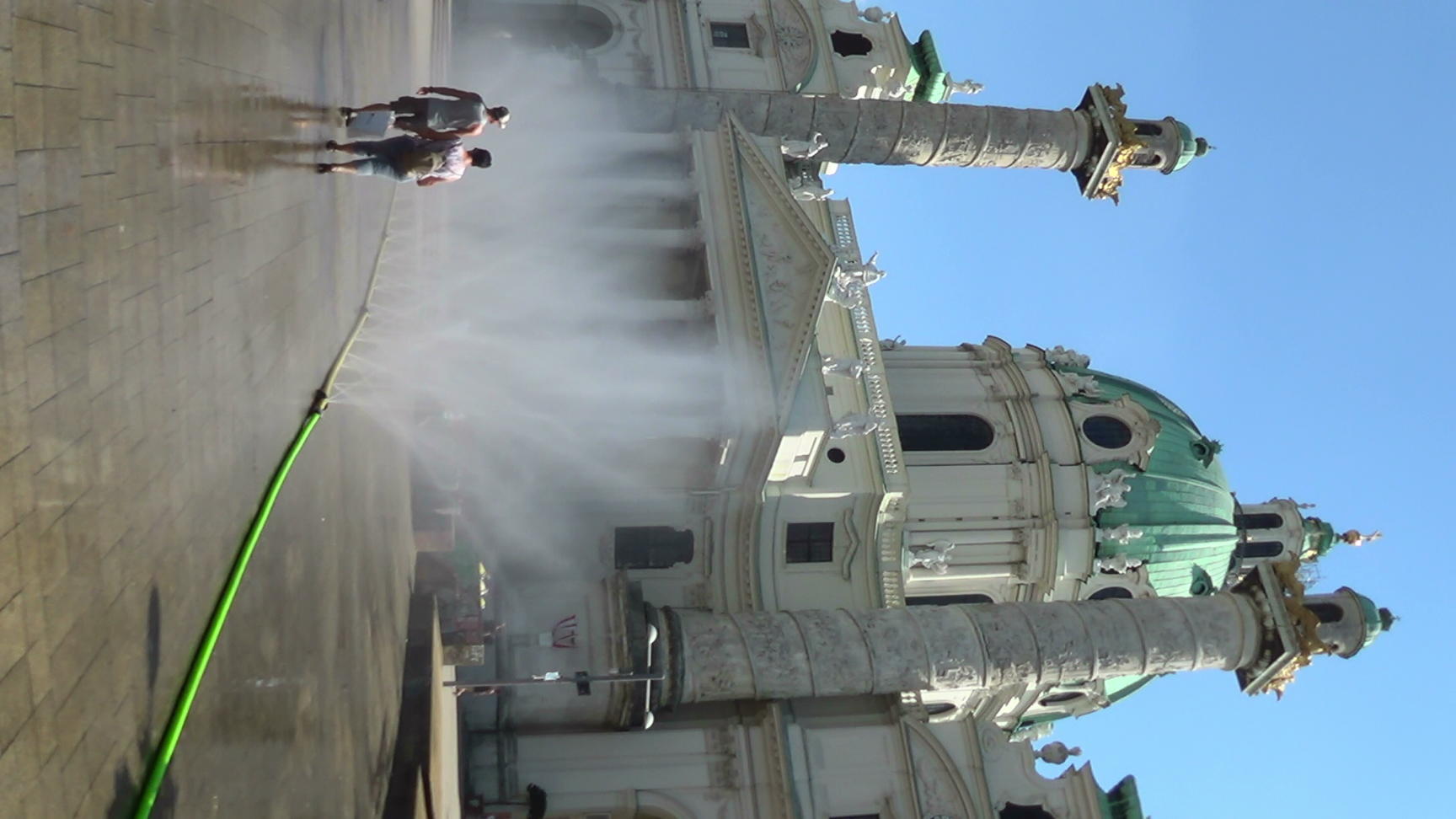 On a hot summer day, the municipality of Vienna provides the people with makeshift showers. A hydrant, a firefighter hose, a perforated sprayer – done!