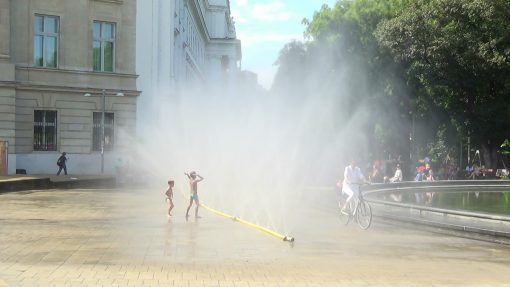 On a hot summer day, the municipality of Vienna provides the people with makeshift showers. A hydrant, a firefighter hose, a perforated sprayer – done!