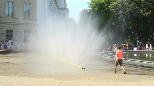 On a hot summer day, the municipality of Vienna provides the people with makeshift showers. A hydrant, a firefighter hose, a perforated sprayer – done!