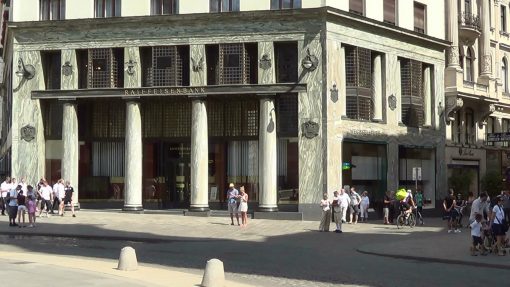 On Michaelerplatz in the Innere Stadt (old town). Hofburg, the former imperial palace, is behind the camera.This is a panorama from Loos House to Kohlmarkt. The Innere Stadt of Vienna is UNESCO World Cultural Heritage Site.