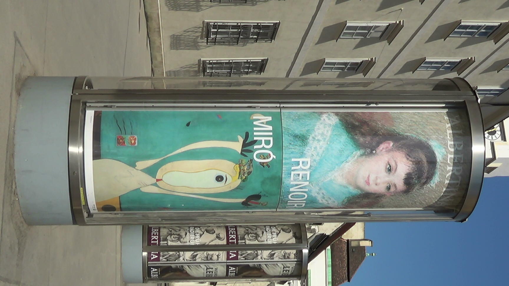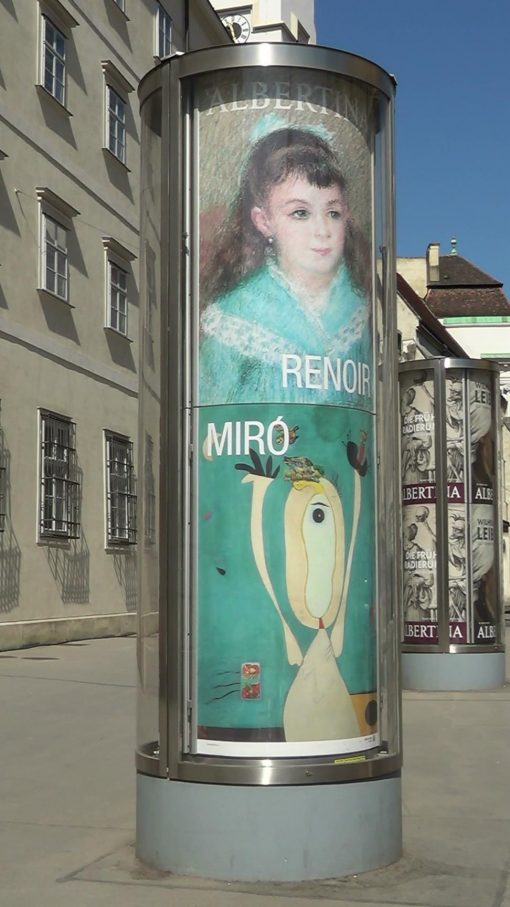 Litfass columns (Columns with advertisement inside. Rotating core, illuminated by night) in front of the Albertina museum in the old town.