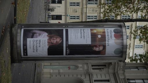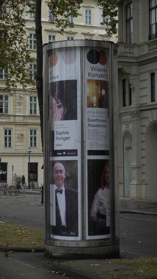 A Litfass column (Columns with announcements inside. Rotating core, illuminated by night) on Ringstraße (Ring Street).