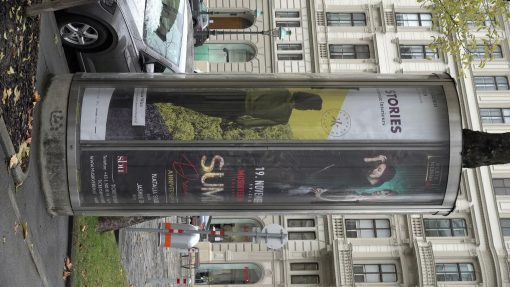 A Litfass column (Columns with announcements inside. Rotating core, illuminated by night) on Ringstraße (Ring Street).