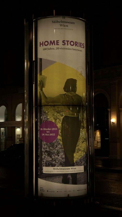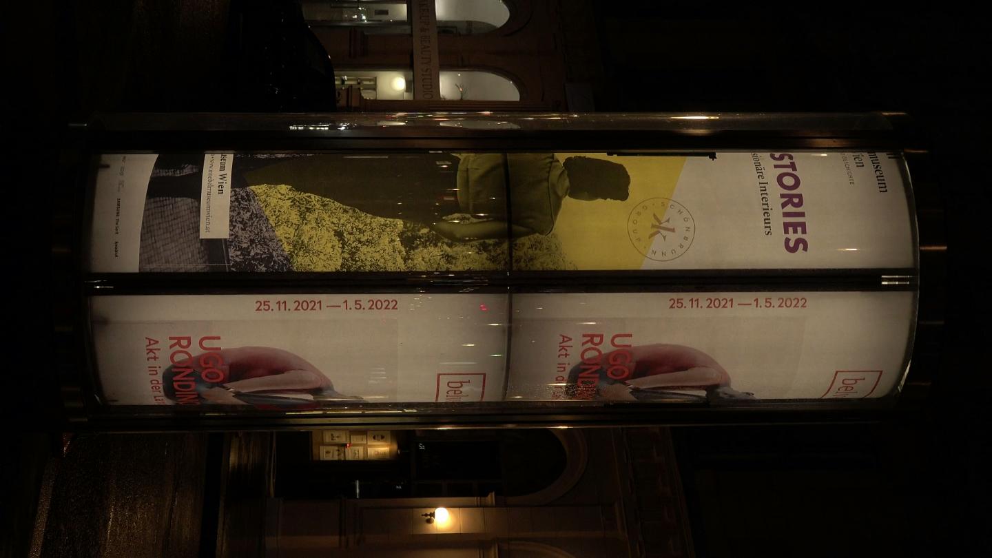 A Litfass column (Columns with announcements inside. Rotating core, illuminated by night) on Ringstraße (Ring Street).