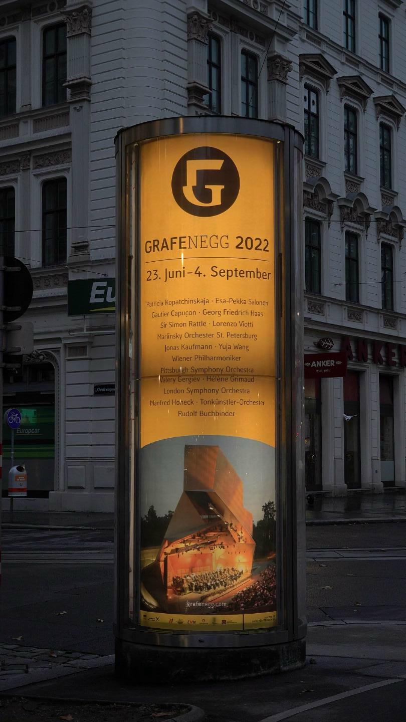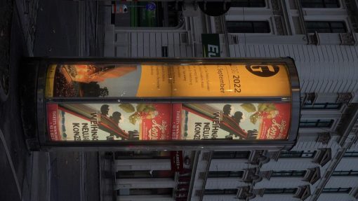 A Litfass column (Columns with announcements inside. Rotating core, illuminated by night) on Ringstraße (Ring Street).