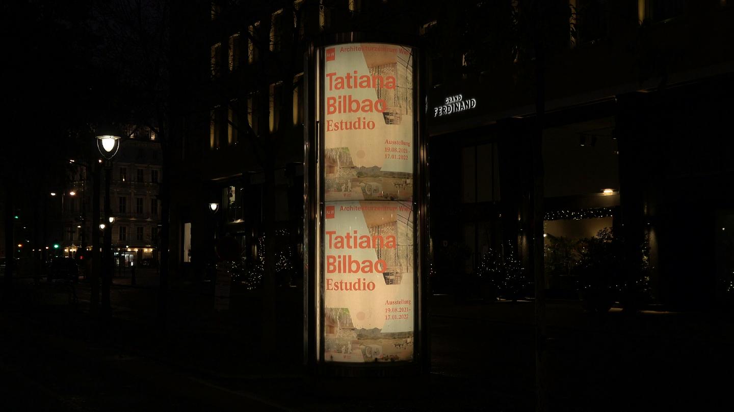 In the alley of Ringstraße (Ring Street), the street that encircles the old town. This is one of the typical Viennese Litfass columns (Columns with announcements inside. Rotating core, illuminated by night).