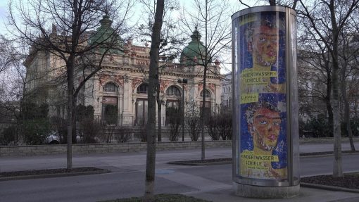 In the alley of Ringstraße (Ring Street), the street that encircles the old town. This is one of the typical Viennese Litfass columns (Columns with announcements inside. Rotating core, illuminated by night).
