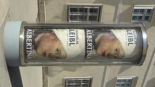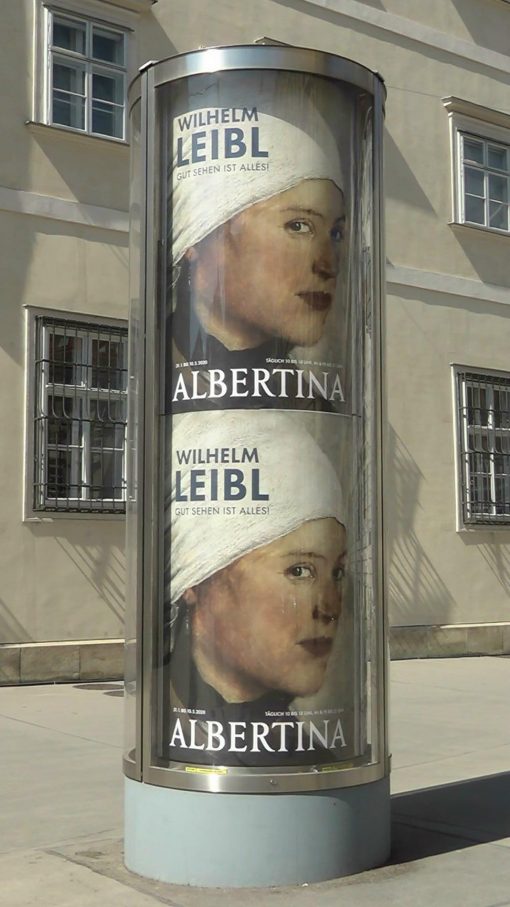 A Litfass column (Columns with announcements inside. Rotating core, illuminated by night) in front of the Albertina museum.