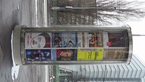 A Litfass column (Columns with announcements inside. Rotating core, illuminated by night) on Ring Street.