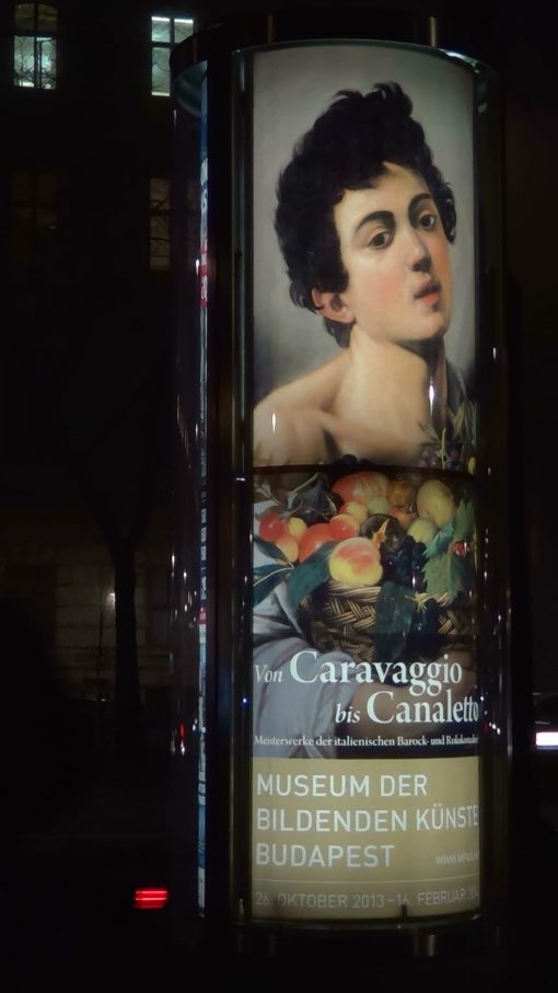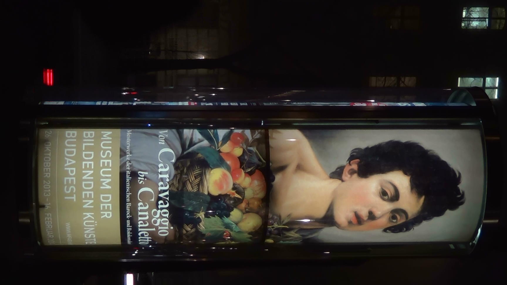 A Litfass column (Columns with announcements inside. Rotating core, illuminated by night) on Ring Street.