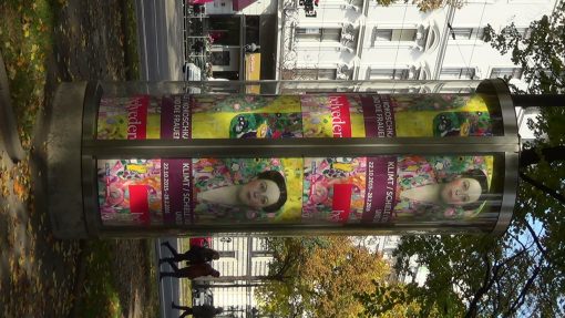 A Litfass column (Columns with announcements inside. Rotating core, illuminated by night) on Ring Street.