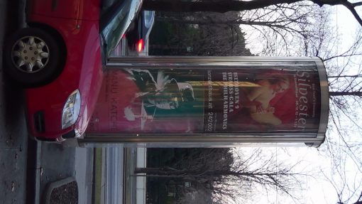 A Litfass column (Columns with announcements inside. Rotating core, illuminated by night) on Ring Street.