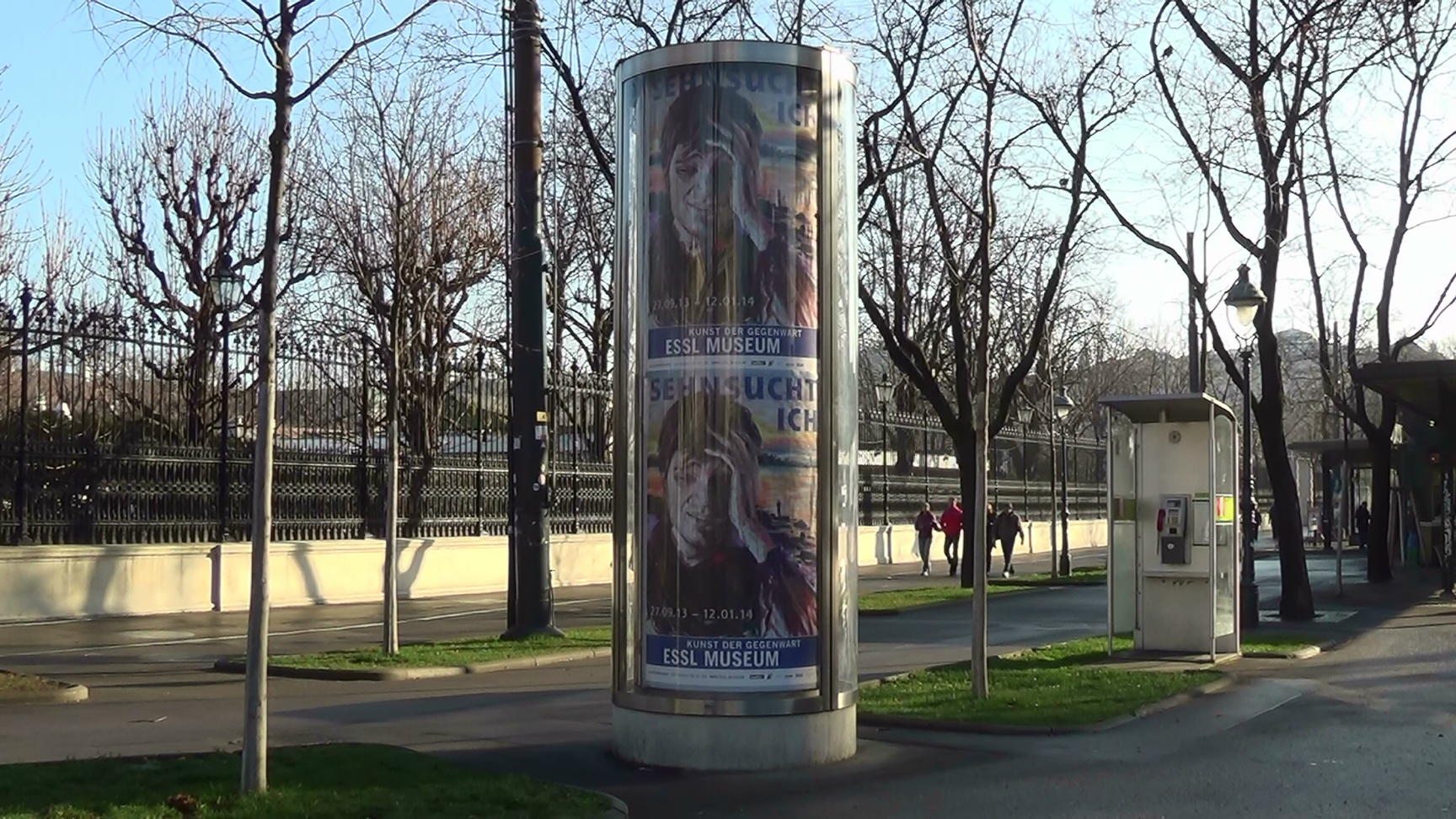One of the typical Viennese Litfass columns along Ringstrasse (Columns with announcements inside. Rotating core, illuminated by night). This is the same column as in clip no. 12757, here centered.